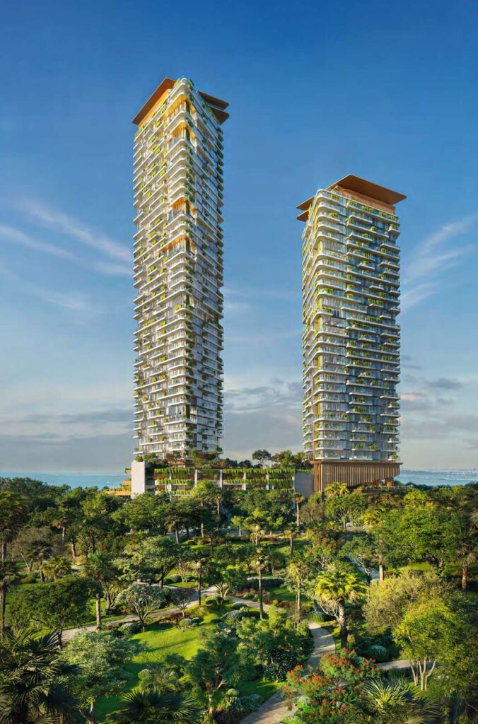 Composé de deux tours sculpturales de 44 et 31 étages, Soulever affiche une silhouette iconique immédiatement reconnaissable sur le littoral de Dubaï. Les architectes de SAOTA ont dessiné des tours élancées évoquant deux voiles modernes s’élevant vers le ciel. Leurs façades mêlent de larges surfaces vitrées du sol au plafond et des accents de métal bronze, reflétant les scintillements de la mer et du soleil couchant. Des balcons étagés en cascade courent le long des bâtiments, dessinant de généreuses terrasses extérieures qui animent les volumes et offrent une vue à 360° sur les environs. Cette approche biophilique intègre aussi la nature au design : terrasses plantées de verdure, toitures végétalisées et lignes ondoyantes confèrent aux tours une esthétique à la fois contemporaine et apaisante, en harmonie avec le paysage côtier.